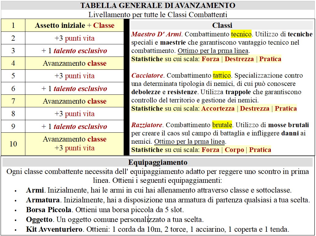 Le Classi Combattenti [Maestro d'Armi, Razziatore e Cacciatore] sono progettate per essere in prima linea.