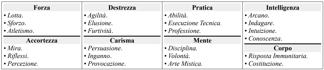 • Abilità. Tutto ciò che riguarda l' abilità generica in una pratica che non sia considerata professione o offensiva.