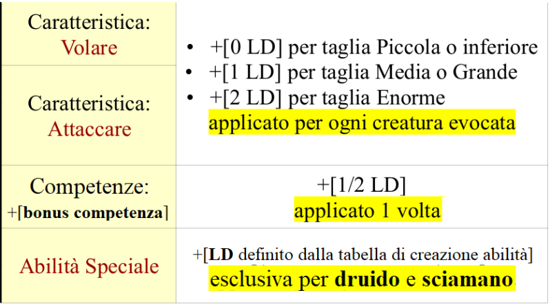 - Esempio: Cavallo ➞ taglia grande | non vola | non attacca | nessuna abilità capacità o abilità speciale = LD totale 3.